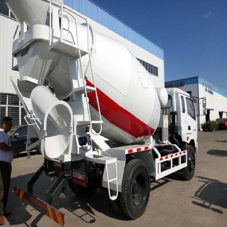 小型混凝土搅拌车组成为:二类底盘、传动系统、液压系统、车架、搅拌罐、上下料装置、供水系统、控制系统、梯子等组成,搅拌罐前端与减速机连接,安装在机架前部,后端支撑由两个支撑轮通过滚道安装在车架后部。